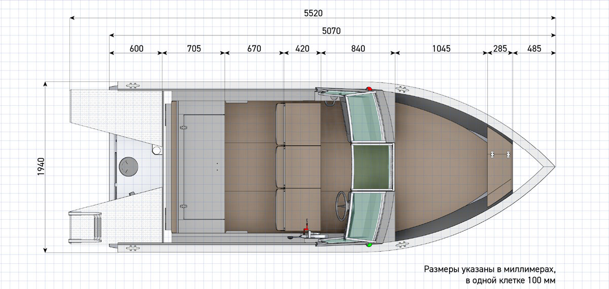 Длина основного кокпита (от кормовой перегородки до основания консолей) 264 сантиметра. Это позволяет разместить в салоне нашу фирменную систему трансформирущихся в спальное место рундуков-сидений.