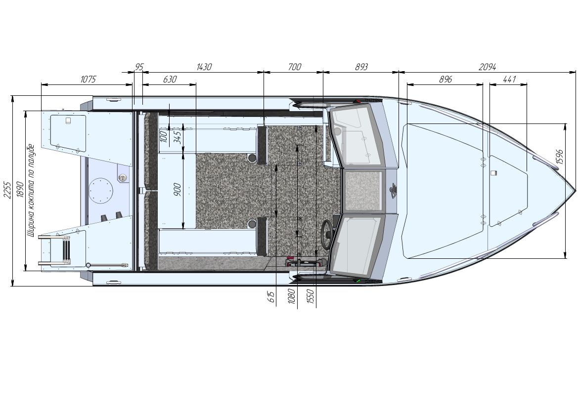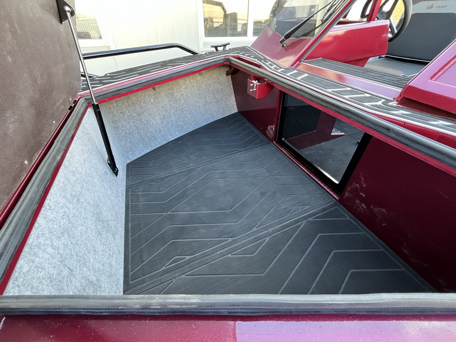 Вместительный грузовой отсек. Объем 640 литров позволяет без труда разместить все необходимые вещи и оборудование для рыбалки или семейного отдыха. Общий объем всех рундуков и ниш составляет 2000 литров! Этого пространства достаточно, чтобы взять с собой всё необходимое для идеального отдыха на воде. Кроме того, по левому борту предусмотрена ниша длиной 2,5 метра, где можно удобно разместить спиннинги, удочки и зонты.